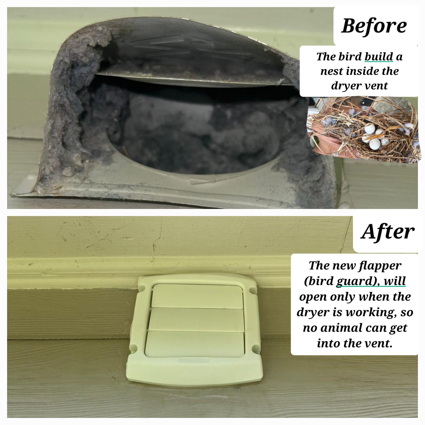 We inspect and clean the exterior vent cover, making sure the vent opens properly and is not blocked.